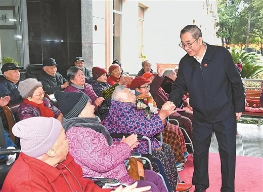 圖為12月12日,全國政協(xié)副主席、中央代表團(tuán)副團(tuán)長馬飚在仙源公司夕陽紅養(yǎng)老中心看望老人。